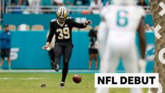 Charlie Smyth makes an impressive NFL debut for the New Orleans Saints with a 56-yard field goal and a successful onside kick in their 21-17 defeat to the Miami Dolphins.